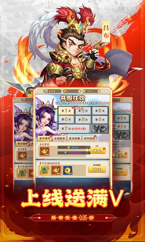 ★所有充值档位0.05折,首充只需1毛钱,业界良心版本! ★装备熔炼无上限,一时熔炼一时爽,一直熔炼一直爽! ★登录秒送VIP5等级,每日武将免费转换刷新次数! ★创角立得88888元宝、88万金币、前期不愁没钱花! ★7天开服狂欢大福利,四大名将任意领,过关斩将贼轻松!